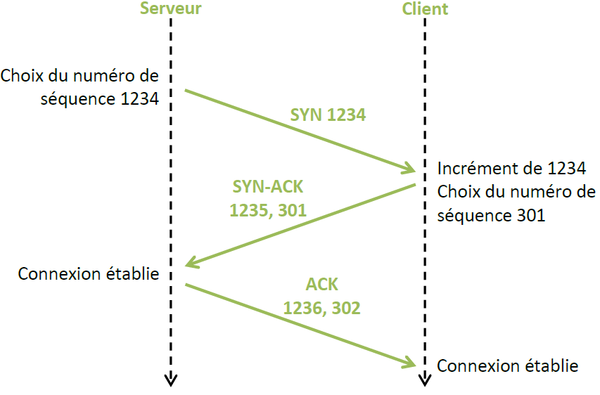 - le serveur choisit un numéro de séquence et envoie au client un paquet nommé SYN indiquant le numéro de séquence choisie ;