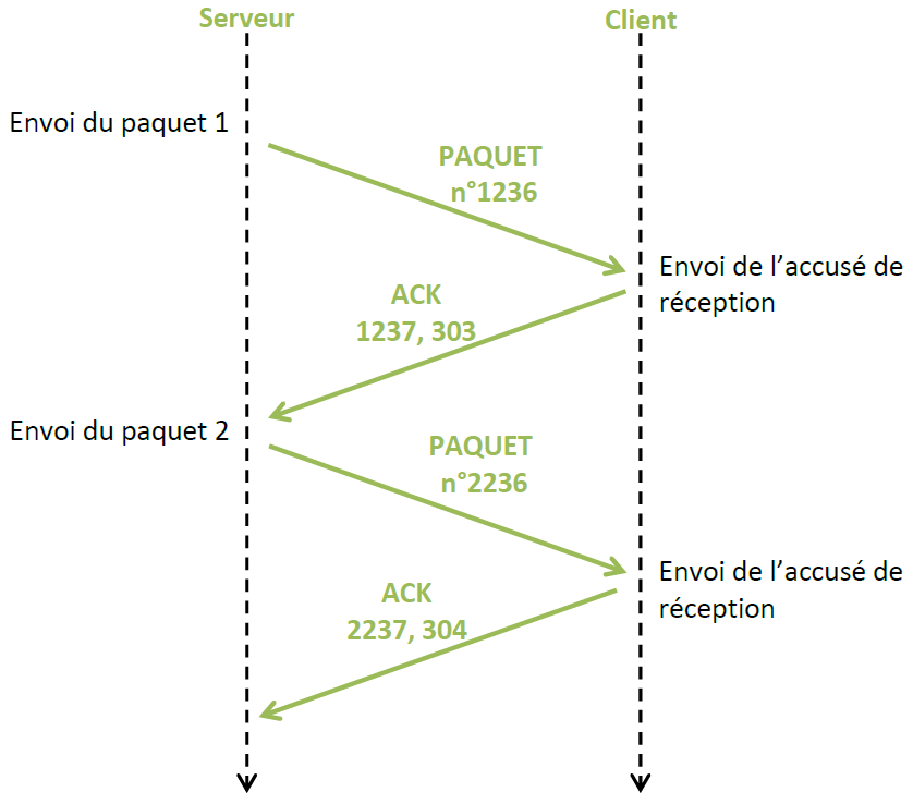 Le serveur peut alors envoyer les paquets de données en poursuivant la numérotation (incrémentation correspondant à la taille en octets des paquets échangés).